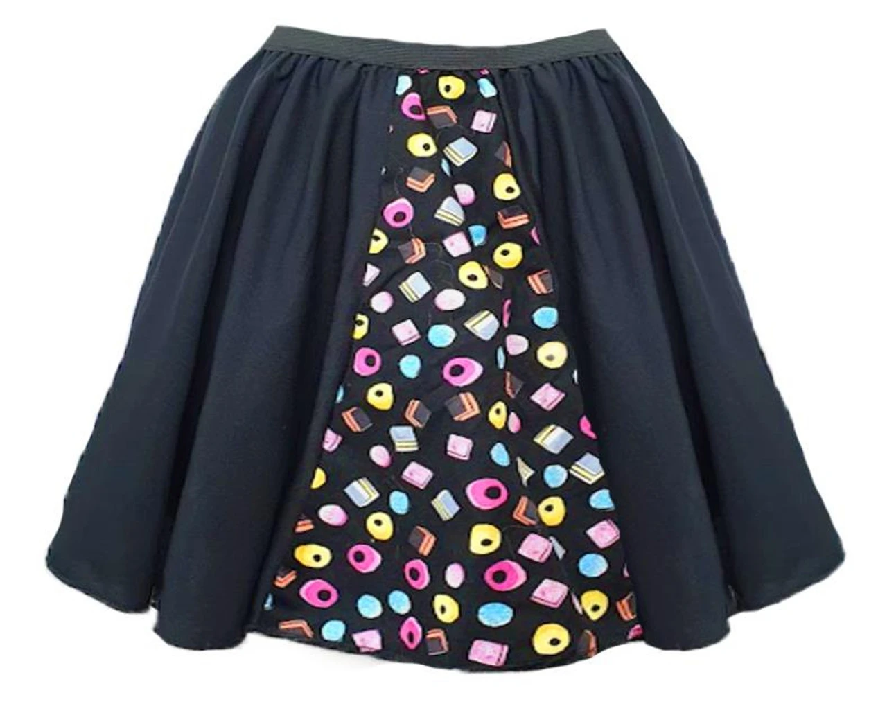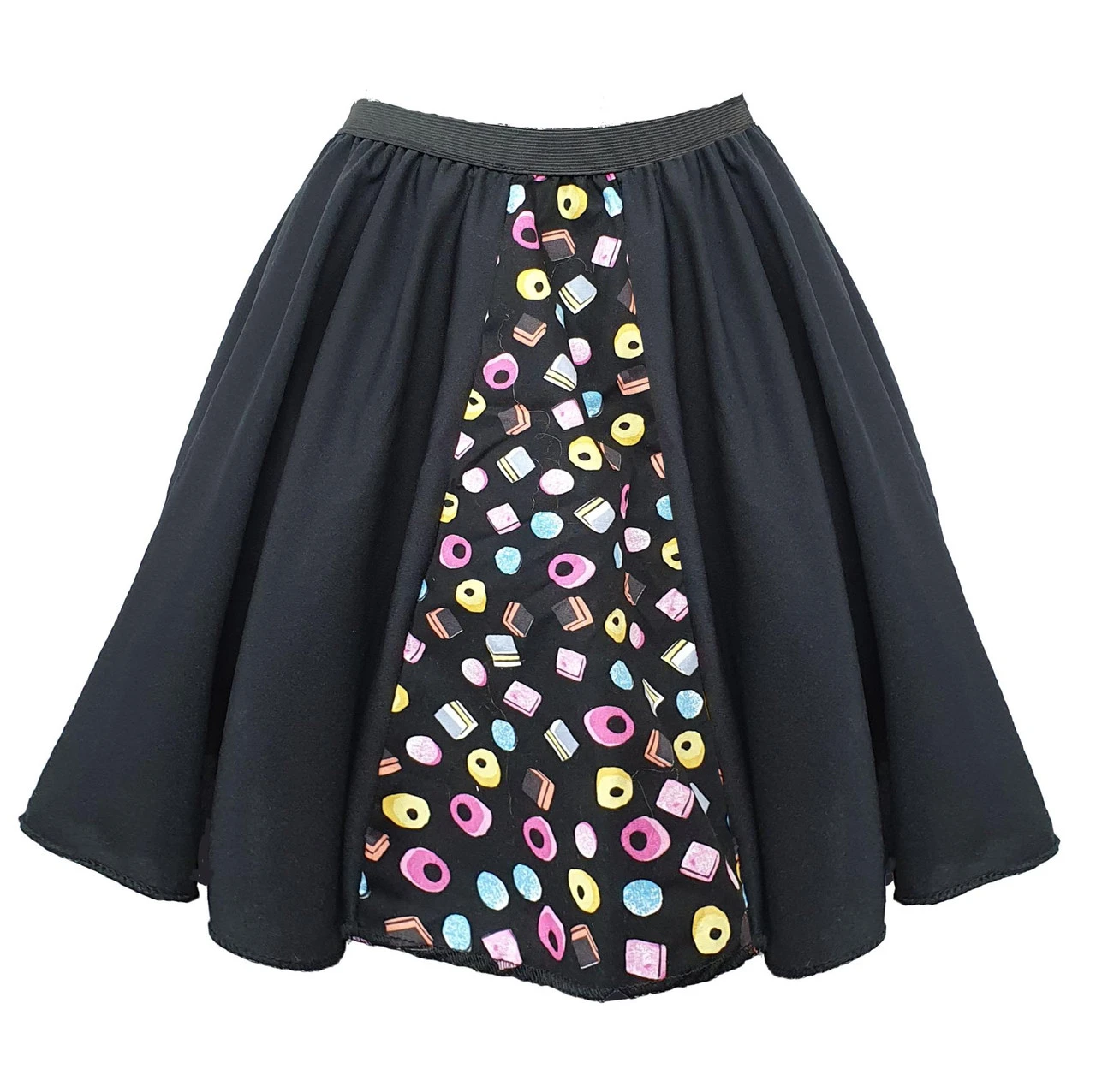 Ladies Assorted Liquorice Sweets Mad Hatter 15″ Panelled Skater Skirt Fancy Dress